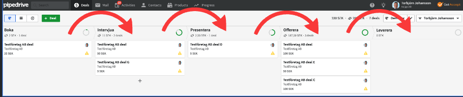 Många säljorganisationer mäter "bara" uppnådda avslut månadsvis. I min liknelse skulle det innebära att Vasaloppsåkaren bara klockar sluttiden utan mellantider. Det skulle kunna innebära att han fastnar i snöret på någon kontroll och inte kan slutföra Vasaloppet. Om man istället mäter förflyttningarna i realtid mellan varje steg i säljprocessen så upptäcker man snabbt om man är i balans eller inte (kolla ringarna i varje processteg). Det blir tydligt vilka delar som sackar efter och vart säljarna behöver fokusera sin ansträngning för att få en långsiktigt hållbar pipeline och säljutfall. Genialt eller hur?