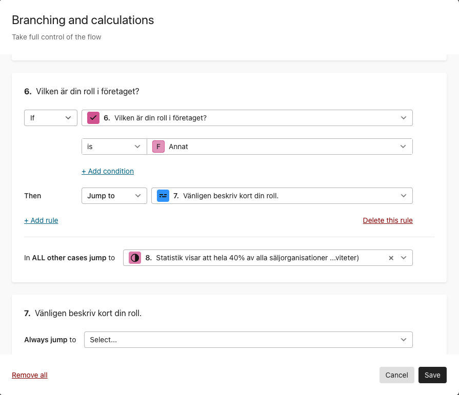 I Typeform har man löst detta genom att införa logiska flöden (och grenar) där man kan hoppa till olika ställen i formuläret beroende på svaret i frågan.