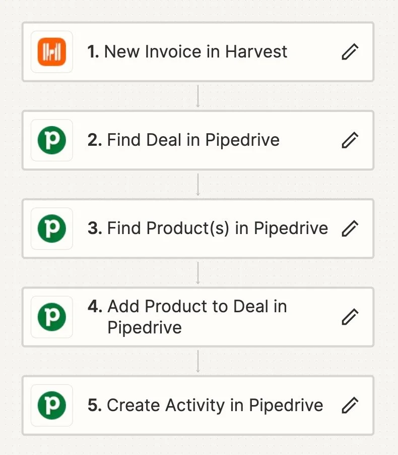 När fakturan skapas i Harvest skickas en trigger till Zapier. Då jag har projektnumret kan jag enkelt leta fram rätt DEAL i Pipedrive. Jag letar fram rätt produkt i Pipedrive och lägger till den till affären med uppgifterna från Harvest. När det är klart skapar jag en aktivitet i Pipedrive som påminnelse att fakturera.