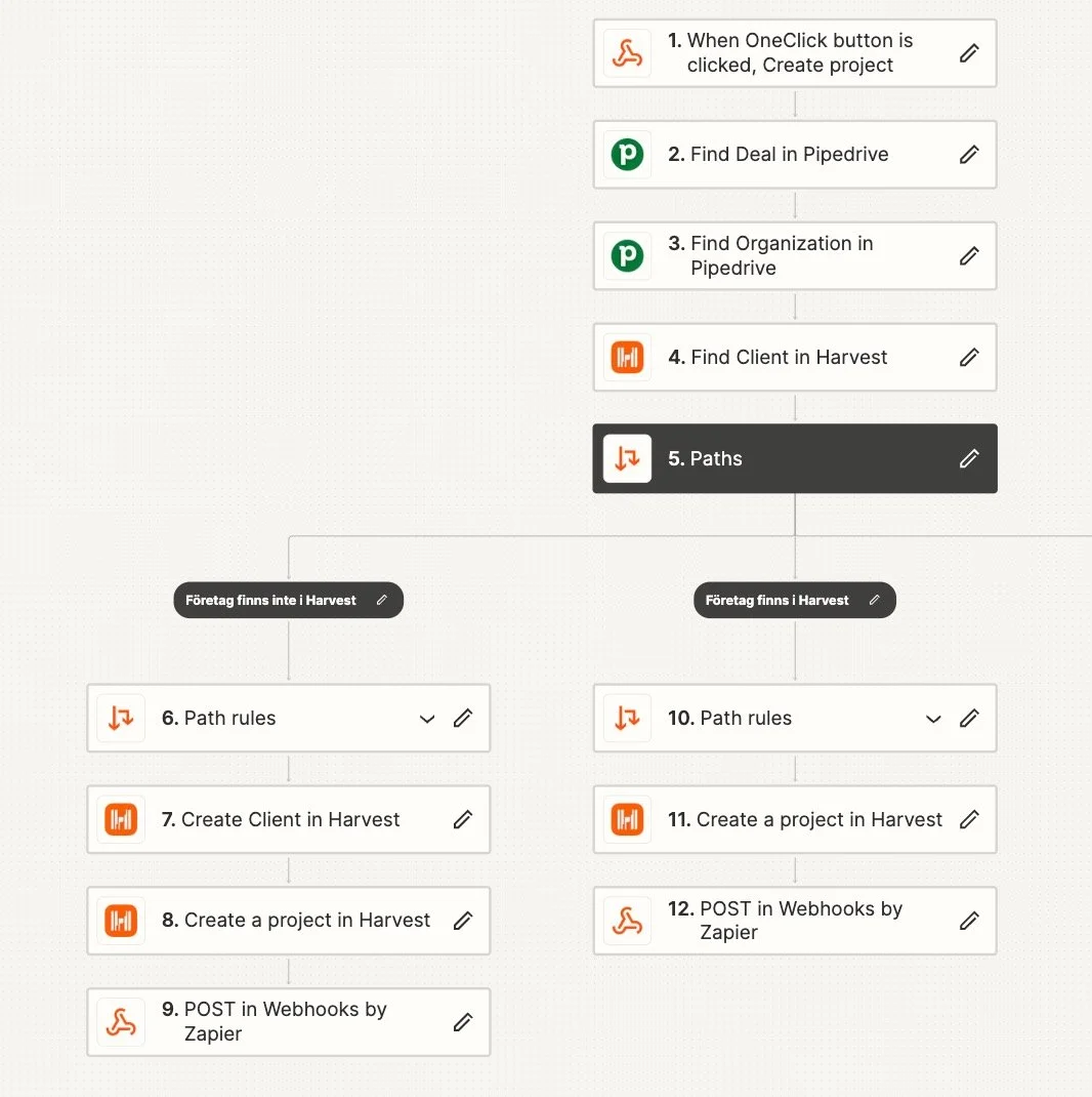 Jag skapade en knapp i Pipedrive för att jag vill själv kunna bestämma när projekt ska skapas i Harvest. Det jag behövde hantera var att ibland tillhör projektet en ny kund och då måste jag även skapa kunden i Harvest. Dessa två flöden hanterade jag med Zapier PATHs.