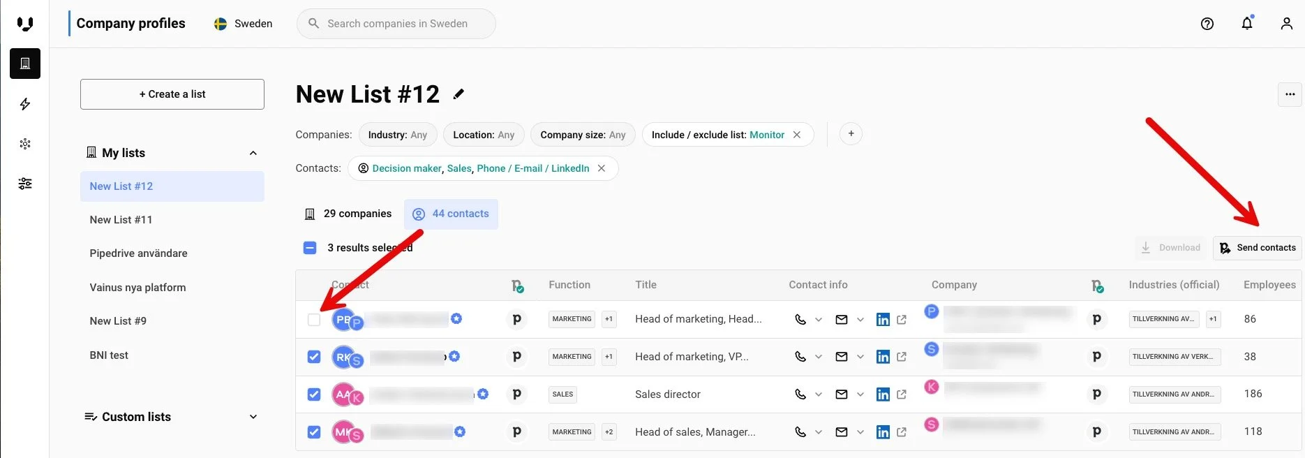 När du fått resultatet av dina sökkriterier väljer du vilka kontakter du vill skicka till Pipedrive genom att markera kryssrutan längst till vänster i tabellen (du kan enkelt välja alla i tabellhuvudet). Klicka sedan på knappen “Send contacts” uppe till höger och välj därefter vad du vill skicka och skapa i Pipedrive (person, organisation, prospekt, affär, aktivitet etc).