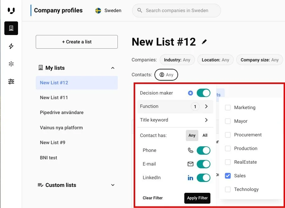 Vainu har gjort det möjligt att filtrera kontakter baserat på om de är beslutsfattare eller inte och deras funktionstillhörighet så att du enkelt kan hitta exakt de personer du vill prata med. Det är också möjligt att filtrera kontakter baserat på tillgängligheten av kontaktinformationen, så att du kan se till att Vainu har ett telefonnummer, en e-postadress och/eller LinkedIn-profillänk för kontakterna du hittar i Vainus databas.
